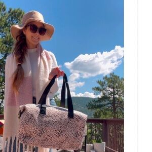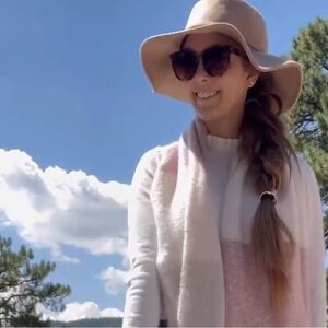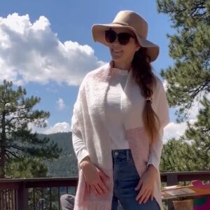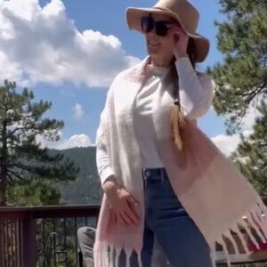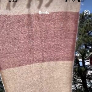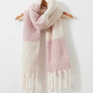 Pink, tan, cream fringe scarf. Poly. 16.5” x 80”