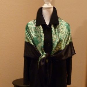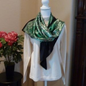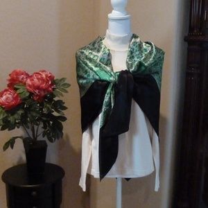 Scarf or Wrap, Black Border with Green and Silver Floral pattern. 46" x 46". Polyester Satin.