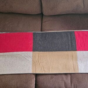 Scarf By Hansilk Red Gray  Tan Flannel Feel Size 72" x 12" Fringed edge, In good condition.