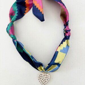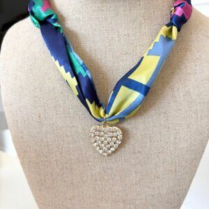 Beautiful colorful scarf with heart pendant to add a pop of color to any outfit! Scarf is silky and heart pendant is gold-toned with crystals on the front.