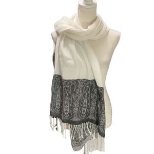 Scarf Wrap Cream Charcoal Paisley 3” Fringes 28” x 73”