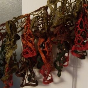 Two knit scarves. One is great fall colors and the other is a chevron print white green and blue.