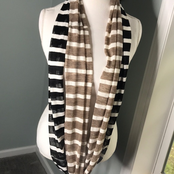 One black and white striped, one tan and white striped. Lightweight and great for anytime of the year when you want a little extra something to add. Soft material, rarely worn and in a smokefree home.