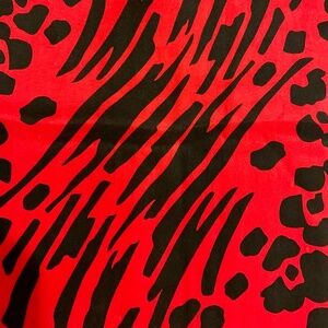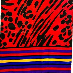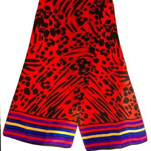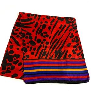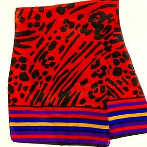 ECHO vintage silk oblong scarf in red and black colors with geometric design, double faced style.Could be used as a handbag tie. Scarf is in excellent condition no visible flaws, good as new from a smoke free house.