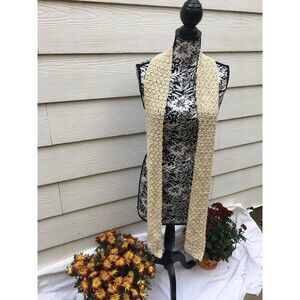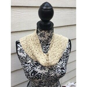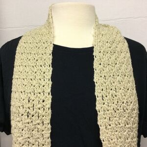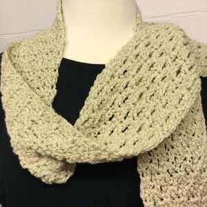 Hand crochet glitter scarf. Long shimmering light weight Light brown , beige tan color sparkling shimmering glitter yarn. Catches the light. Can be worn a variety of ways. Measures approximately 74”x3 1/2”. New. From a smoke free and pet free home.