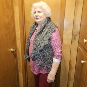 Scarf vest 15% wool black and Grey. Unkown brand and size. excellent condition. I'm not sure what to call it for sure. you put it on like a scarf and it looks like a vest. my Mom was sweet enough to model it. very warm and cozy.