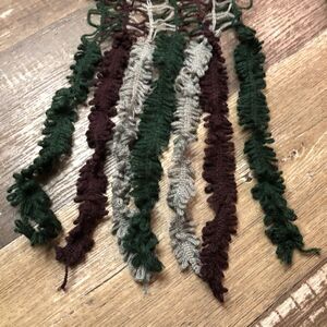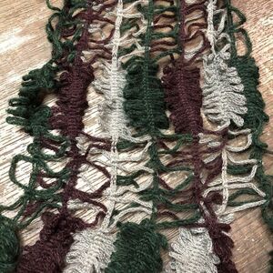 Scarf Open hand Knit crocheted Fringe Gray Green Burgundy Leaf Accent