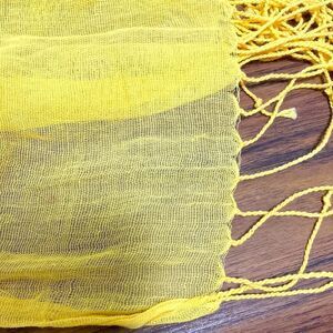 Oblong scarf/wrap in yellow crinkled cotton with fringe. Lightweight.