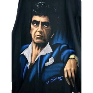 The t-shirt is machine washable and suitable for all seasons, including winter, summer, fall, and spring. It comes in a size 3XL and is part of the big and tall collection for men. The shirt was manufactured in the Philippines between 2000-2009 and features Tony Montana from the movie Scarface. Perfect for casual wear, this shirt is a must-have for any Scarface fan.