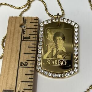 This striking Scarface dog tag necklace features a bold gold-tone finish and dazzling iced-out detailing, perfect for fans of the iconic film looking to make a statement. It appears that five blingy stones are missing, really hard to tell unless you look close. Please see photos for best physical description and to ensure you like what you see. All photos are taken of the ACTUAL item/items you will receive.