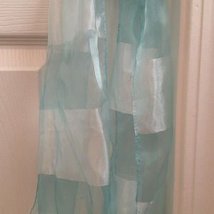 Blue striped scarf that can also be won as a belt. Satiny texture.