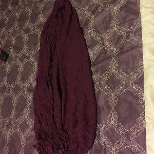 Two wonderful, great condition scarfs!! One is a deep pink with fringes at the end has a nice ruffle flow to it..the other is a wide purple scarf with fringes at the end, this scarf can be worn in many different ways..both have only been used a couple of times and has a lot of life left