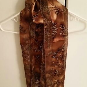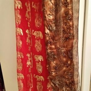 Brown/gold and red/gold silk feel elegant design wear with jeans and turtleneck or evening dress or suit. 2 scarfs for one price