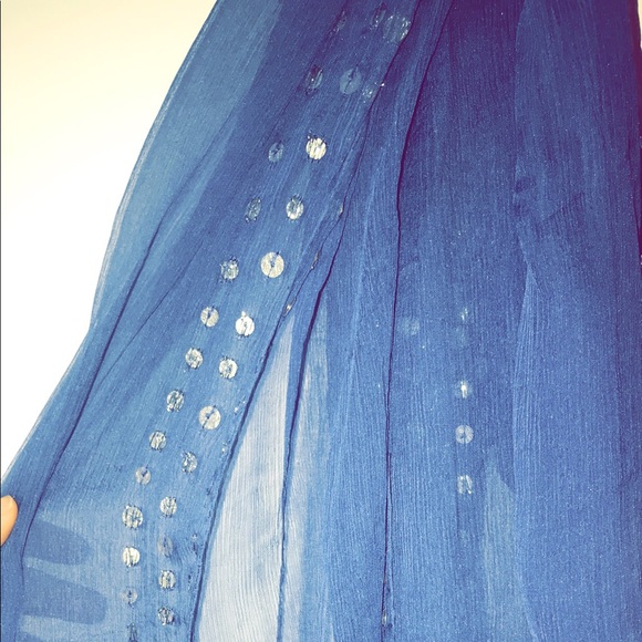 This scarf is a sheer blue with sequence running down the scarf. The scarf has been worn once and needs a new home.