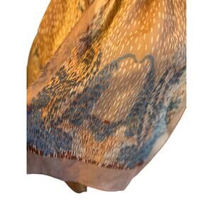 The scarf appears to be a Hermes Cashmere Silk Shawl scarf. Features a beige background with a pattern of white and brown dots and a central blue and brown motif. I can not validate this. 10.5" x 46"