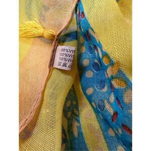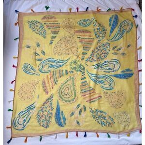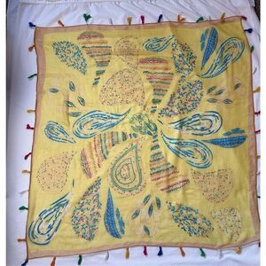 Unbranded women’s rayon yellow & blue abstract scarf with multi-colored tassels, size 38”x38”