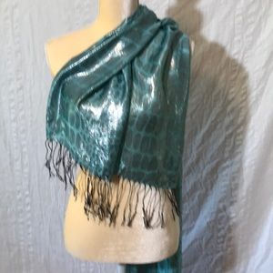 Absolutely beautiful! Seafoam blue/green with silver shimmer! Perfect for spring or winter! In excellent used condition. I see no stains, fades or tears. Approximate measurements are: 71 inches long and 21 1/2 inches wide. Please feel free to ask questions!