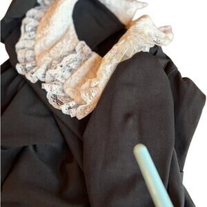 Scarlet Darkness dress in good condition without much wear but there is a small pucker on outside of right sleeve - see photo - and loose threads here and there. There are no stains, snags, holes or fading. Features include a fitted bodice with princess seams, lace collar, puff sleeves, side zip and a flared hi-low skirt. The material is a poly spandex blend and is stretchy and substantial. Measurements app'x: 17 inches pit to pit, 13 across waist, 33 long in front and 43 in back.
