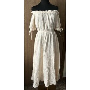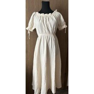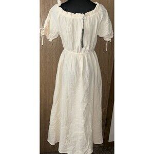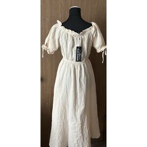 The Scarlet Darkness NWT Women's Renaissance Cotton Apricot Off Shoulder Pocket Dress is a stylish and elegant A-line dress made from cotton, perfect for the warmer seasons of summer, fall, and spring. With a solid pattern, off the shoulder neckline, and short sleeves, this dress offers a flattering and comfortable fit. The long dress length and inclusion of pockets add practicality to the design, making it a versatile and trendy choice for any woman's wardrobe.