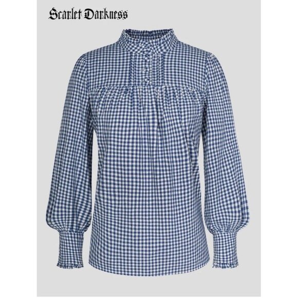 Step into timeless elegance with this Victorian-inspired blouse from Scarlet Darkness. Featuring a blue and white gingham pattern, this top boasts a high ruffled neckline, delicate front buttons, and gathered lantern sleeves with elastic cuffs. The lightweight fabric offers breathability and comfort while maintaining a structured, vintage silhouette perfect for cottagecore or classic looks.
