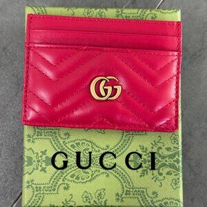 Make a bold statement with this scarlet Gucci card case, adorned with a shining gold GG logo and expertly crafted from quilted leather.
