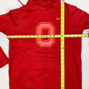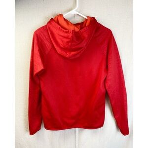 Scarlet red with subtle pattern on sleeves and hood - size small - gently worn, no flaws