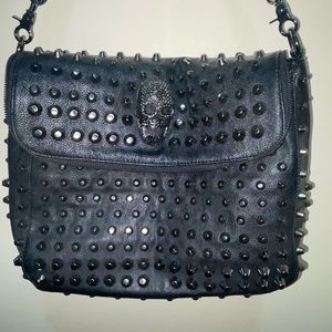 Skull obsessed! Ultra soft synthetic vegan leather. Fabric lining. Black hardware- studs all over and big Skull front and center.