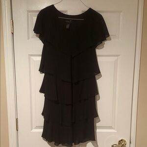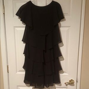 Sophisticated black mini dress with layered design. Ideal for evening wear.