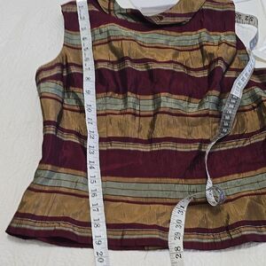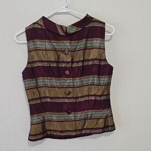 Embrace elegance with this fitted tank top from Scarlett, featuring a striking red and gold color palette. The bib collar adds a sophisticated touch, making it perfect for both casual and formal occasions.