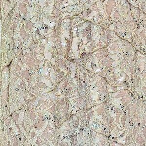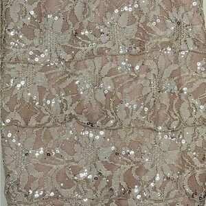 Scarlett Nite Floral Sheath Dress 8P Tan Gray Layered Lace Metallic Cap Sleeves