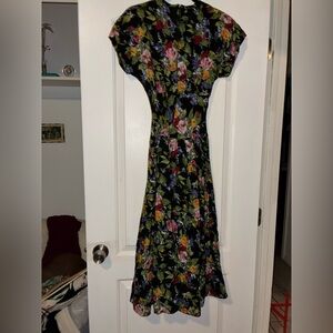 The Scarlett dress is a stunning sheath maxi, perfect for wedding guests or cocktail events. It features a vibrant floral pattern in shades of pink and red, beautifully complemented by short dolman sleeves. The dress's elegant silhouette and eye-catching design make it a standout choice for any special occasion.