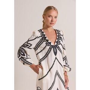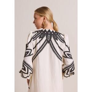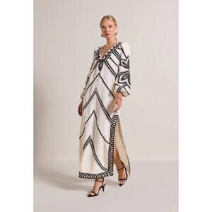 This beautiful HILLARY KAFTAN DRESS boasts a V-neck adorned with applique embroidery, accented with contrasting lurex thread for a touch of sophistication.