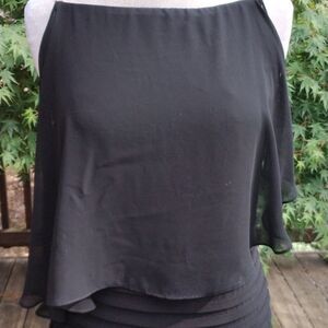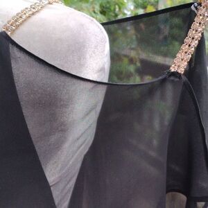 This is a lovely dress, so unique! The straps are rhinestone bands. A sheer capelet covers the knit bodice. The skirt is sheath, and tucked all the way to the hem. Side zip. On the left side sparkly straps on the shoulder and arm. On the right : sparkly straps on shoulder ( missing one small stone, not noticable) arm and wrist. Size 12 measures 42 at chest, 32 at waist, 40 at hips. 40 long from shoulder to hem. This is a beauty.