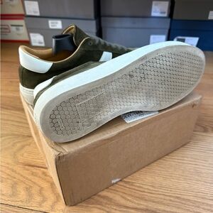 Stylish green suede sneakers with white accents. Perfect for casual wear.