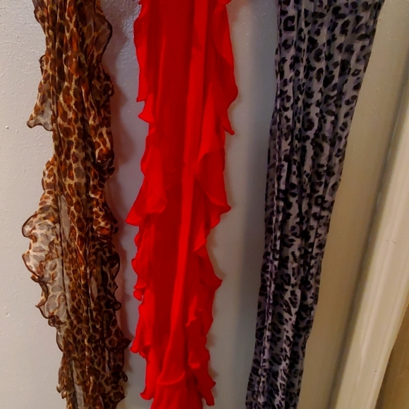 1 ruffled brown leopard print scarf, 1 ruffled solid red scarf, 1 straight seams (no ruffles) black and gray leopard print scarf. Lightly used. Great accessories to any outfit! I cut off the tags because these are slightly sheer and you could see the tags.