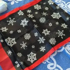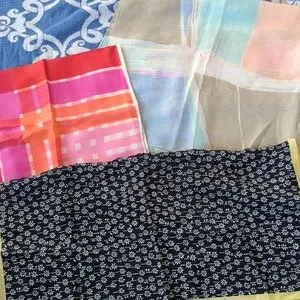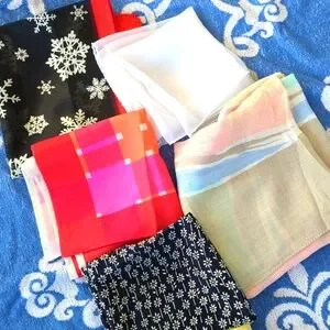 @sandjbonesdoc hello! thank you for your interest! here are the dimensions of the various scarves. you are welcome to request any combination you might be interested in! the black with white snowflakes: 14 in X 58 in. The solid white : 22 X 21 in. the navy with white daisy flowers (100% silk, by Talbot's): 21 X 21 in. the bright pink/orange/red plaid: 23 X 23 in. the pastel colored (100% rayon, by Symphony Scarves) is 30 X 30 in. hope this is helpful!