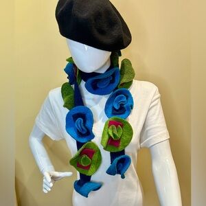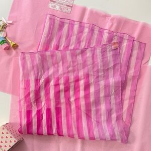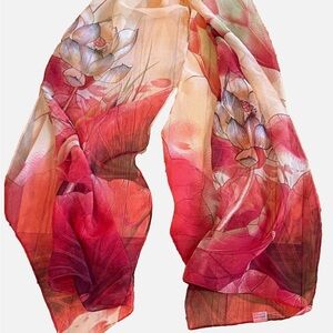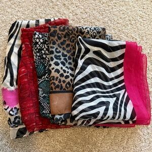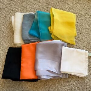 Please look at pictures carefully, last 3 pics, show small flaws or stains on each scarf, pink and green one has pen ink, the dark orange one, which is probably silk, has a bleach spot. At one point I did get these dry cleaned.