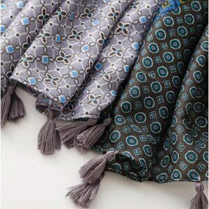 These are beautiful women scarves in blue gray and moss green, made up of light weight voile fabric. The edges are completed with twisted tassels on both sides.
