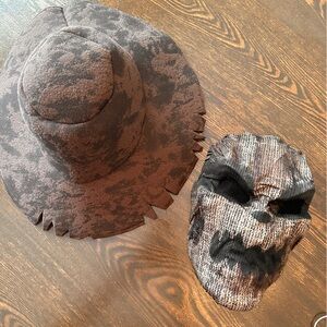 Spooky scarecrow costume in brown with a matching hat, mask, gloves and sickle . Features a rope belt and jagged edges for a creepy look.