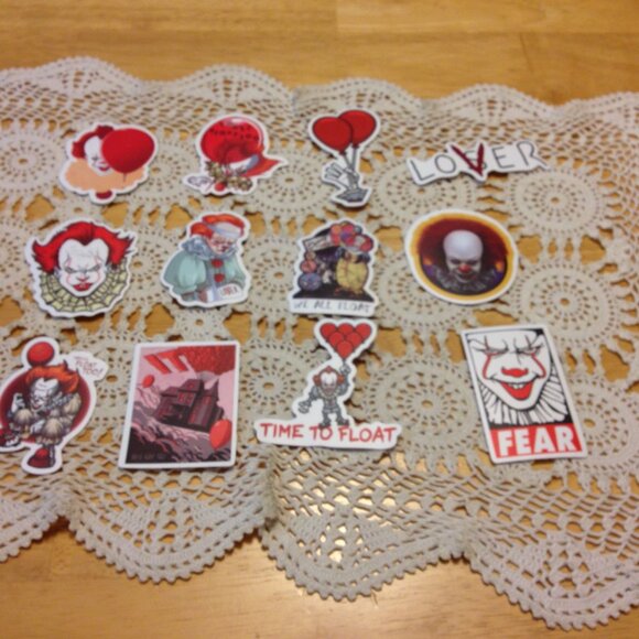 You get 12 new crafts stickers, horror theme, scary clowns, IT, various sizes. Great for craft projects or scrapbooking. Also fun for lockers and cell phones. Spooky fun for Halloween too. Tear-resistant with matte finish. Good for most uses but not best for water bolttles.