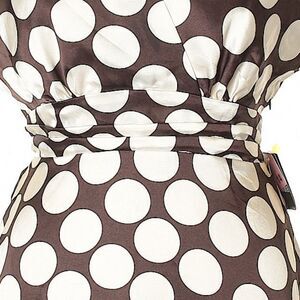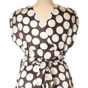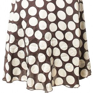 A-Line silhouette. Knee length. V-Neckline. Short sleeves. Brown and cream Polka dot print. Measurements: 35" Chest, 40.5" Length. Tag says 14 but it can fit up to a 16 I think.100% Polyester.