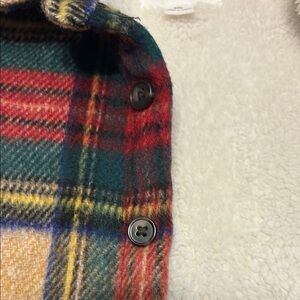 This vibrant jacket features a striking red and green plaid pattern, crafted from a warm wool-blend material. Its sturdy construction and full front button make it perfect for cooler weather.