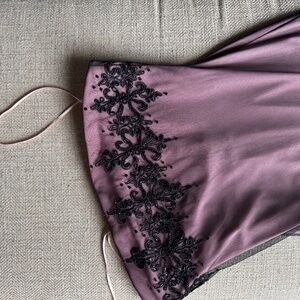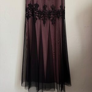 This Scene Vintage strapless gown is a one-of-a-kind showstopper, perfect for weddings, proms, or formal events. The floor-length mermaid silhouette features a purple slip layered under black mesh adorned with intricate black beading details. The inner lining is soft and comfortable, while the outer layers create a dramatic, flowy effect. Vintage with original tags, this dress is in excellent, like-new condition and brings timeless elegance and unique style to any special occasion.