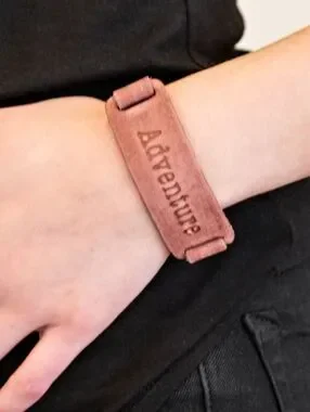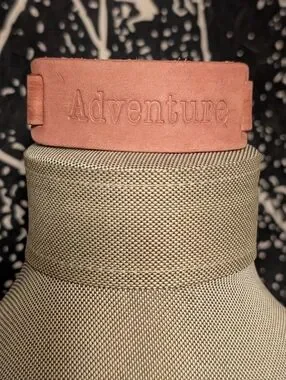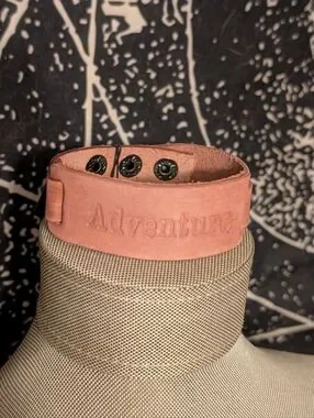 Brushed in a rustic finish, a brown leather band is stamped in the word, “Adventure” for an adventurous finish. Features an adjustable snap closure.