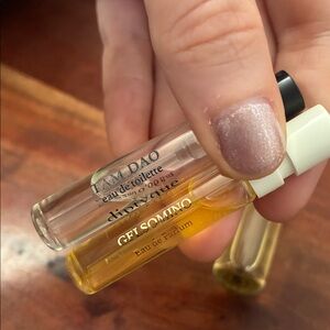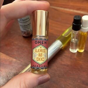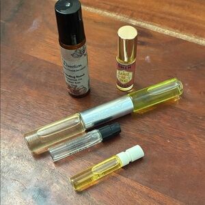 There is an Ujjaya roller with essential oils (almost full), a mini Omen Beauty “love is god” roller, and Diptyque Tam Dao and Santa Maria Novella Gelsomino samples.