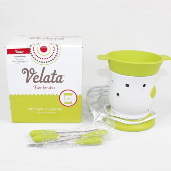 Scentsy Velata Key Lime Pedestal fondue warmer. Made in 2012. This was a display model and needs a good cleaning. Complete in original box. The box is in rough shape.