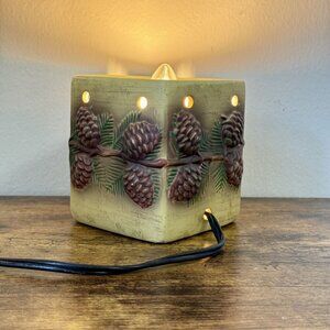 Scentsy Pinecone Wax Warmer, a brown and green, rustic evergreen patterned ceramic piece, offers a touch of fall in any room. This 5" high, retired and tested electric oil, wax warmer lacks a lid.
