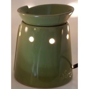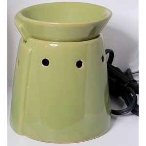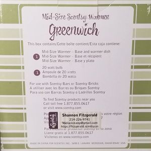 Scentsy Wax Warmer Greenwich Mid Size New in Box. New never used. Opened for pictures and show contents. Box shows wear from storage in spots such as small dents in cardboard or worn edges. This is a Discontinued model. It can also function as a night light with the 20 watt bulb. Please zoom in on pictures for details. No chips or cracks. Outer sides of warmer hqve pottery dimple marks as pictured and wax holder bottom has dimple dark mark that occurred during manufacturing.