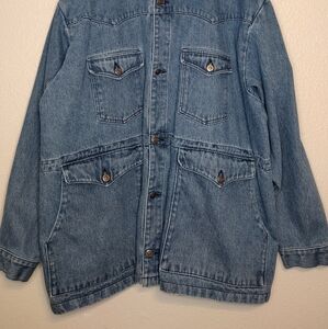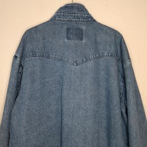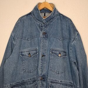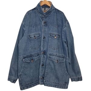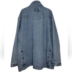 Schaefer Outfitter men's blue denim collar leather oversized barn jacket Sz 2XL.