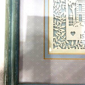 This unique Scherenschnitte of "A Good Neighbor is a Found Treasure" is the perfect housewarming gift. This framed art is crafted from paper and features a pale bluish green matte with a matching blue teal frame . It features intricately cut designs and is a wonderful way to show your appreciation or as a house warming gift.